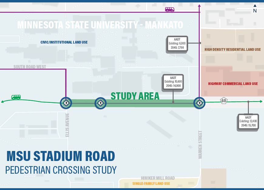 MAPO has partnered with Minnesota State University, Mankato, the City of Mankato, and Blue Earth County to study pedestrian connectivity on Stadium Road between the intersections of Ellis Avenue and Warren Street. The corridor is approximately 1,400 feet and services both university and non-university pedestrian, bicyclist, and automotive traffic. The study goal is to develop potential solutions for improved travel conditions for all modes.